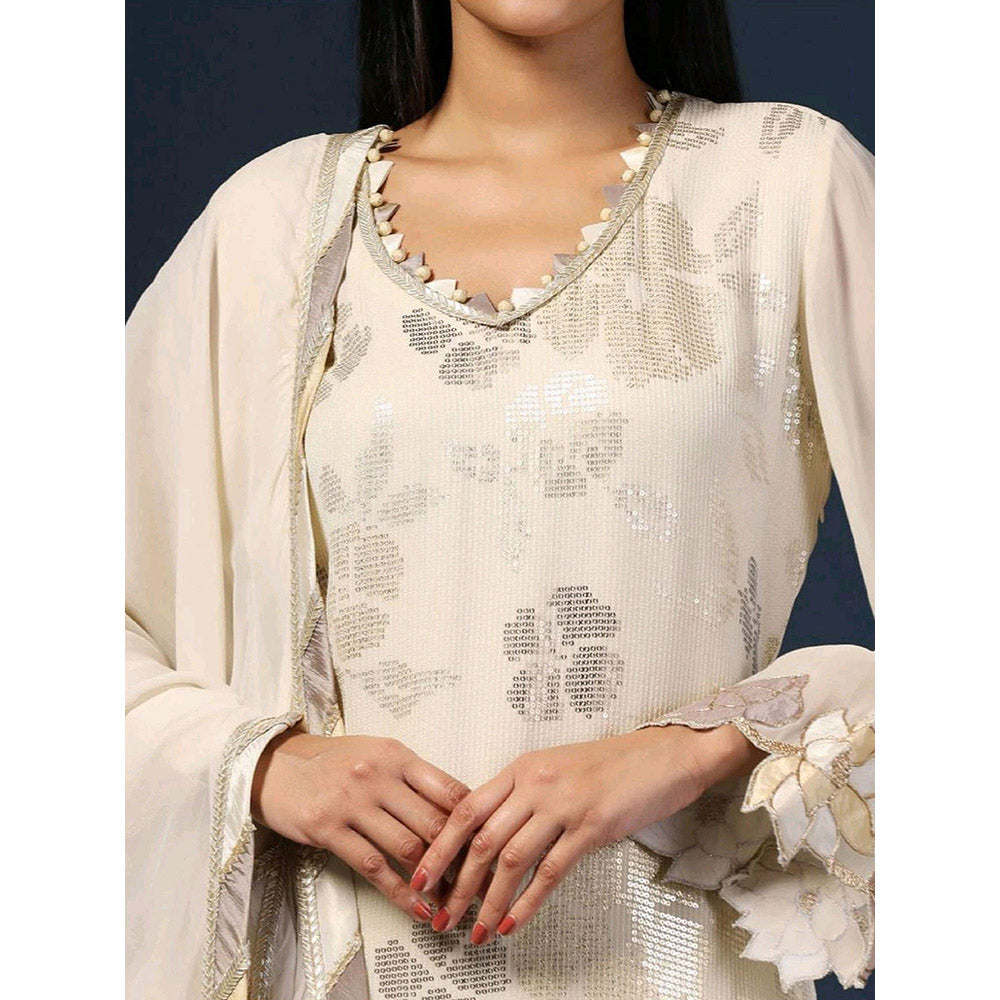 Description : Introducing Our Stunning Georgette Off White Kurta with Flared Sharara Set. The Kurta Showcases Intricate 3D Sequin Work In Metallic Colours with An Antique Finish, Beautifully Complemented By Applique In Matching Hues On Tissue. The Sleeves Feature Delicate Cutwork, Adding A Touch Of Elegance. The Flared Sharara Is Adorned with Applique Work Detailing At The Hem, Creating A Dramatic and Sophisticated Silhouette. The Matching Dupatta Completes The Ensemble with Applique Work and Tassel Detailing, Radiating Elegance and Sophistication. Perfect For Special Occasions, This Set Is Sure To Make A Statement.