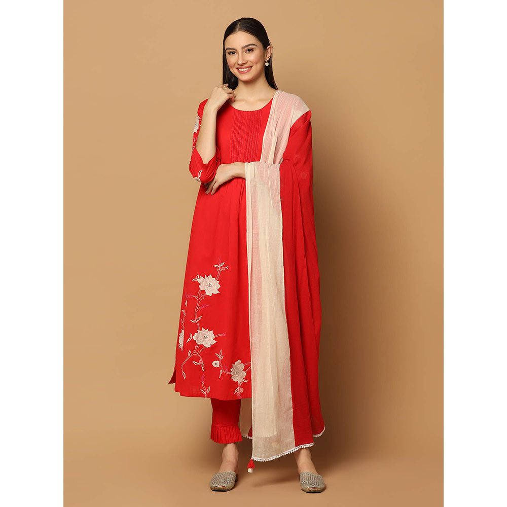 Red Floral Applique Kurta with Pant and Dupatta (Set of 3)