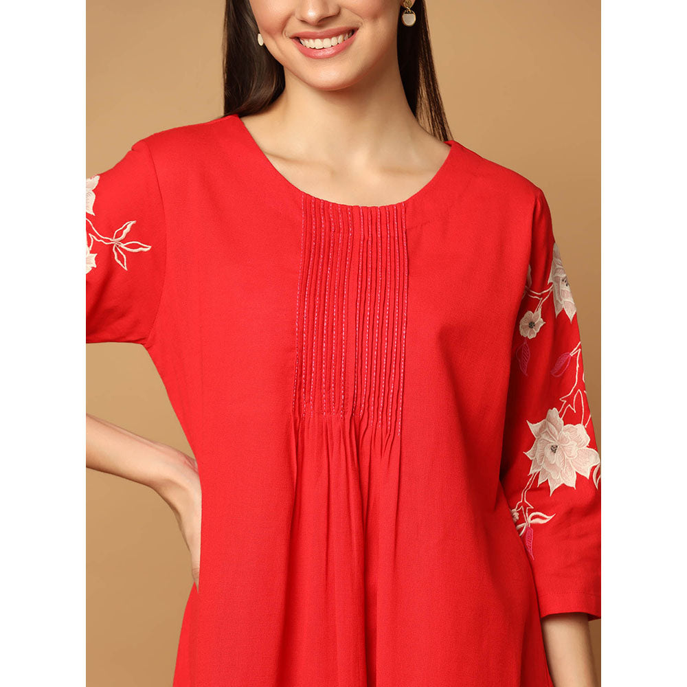 "Two Sisters" by Gyans Red Floral Applique Kurta with Pant and Dupatta (Set of 3)
