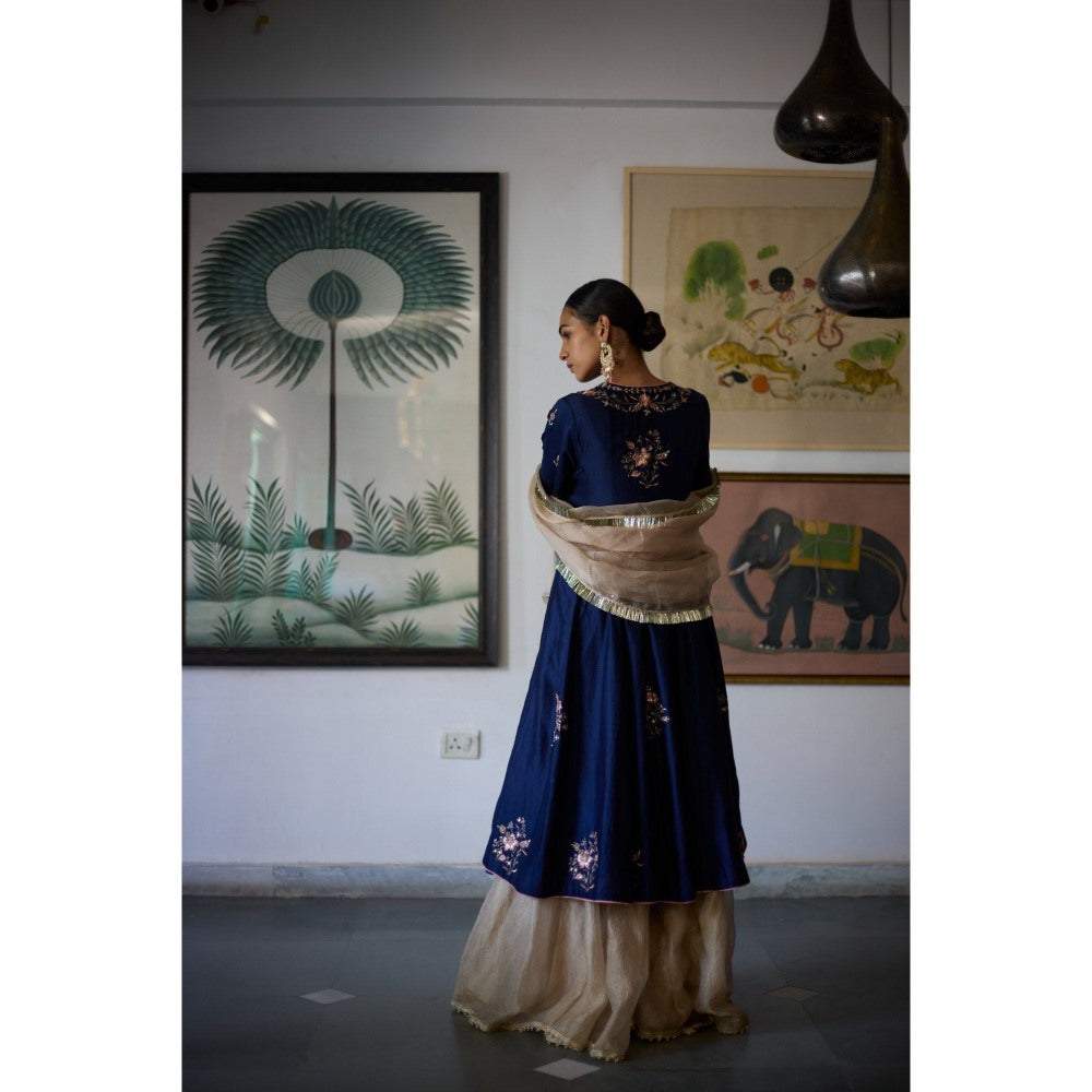 Description : Navy Blue Chanderi Angarkha Cut Embroidered Anarkali Paired with Almond Silk Organza Odani and Silk Tissue Crinkled Sharara.