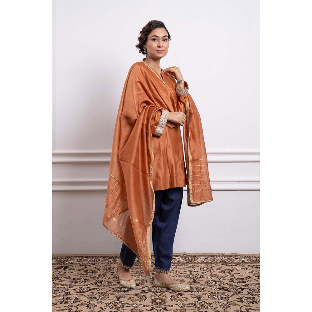 Description : The Saffron Brown Panelled A Line Kurta with Delicate Lace Trims On The Neck and Embroidered Lace On Bell Sleeves. Its Paired with Contrast Blue Embroidered Hem Salwar and Chanderi Dupatta with Woven Gold Zari Border. A Smart Festive Outfit. -Handcrafted In India-100% Authentic Handwoven Chanderi- Embroidery, Lace Details- Kurta and Salwar Are Lined-Garment Made On Order. See The Size Chart & The Size Guide Carefully The Handwoven Fabric Used In This Garment Is Certified Handloom Made In Chanderi, Madhya Pradesh. The Product Is Handmade, and Thus, It May Have Some Irregularities That Are Common To Handicrafts.