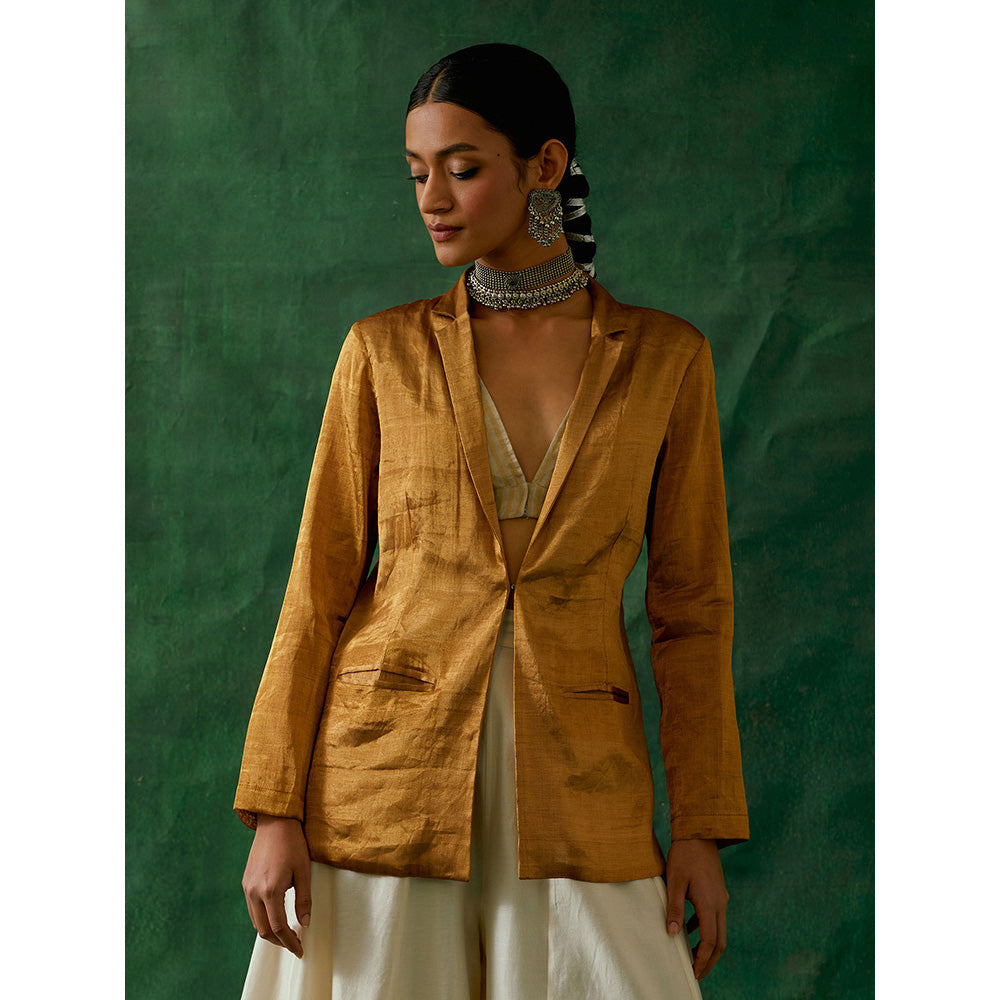 Vinusto Gold Silk Jacket With Crop Top And Palazzo (Set of 3)