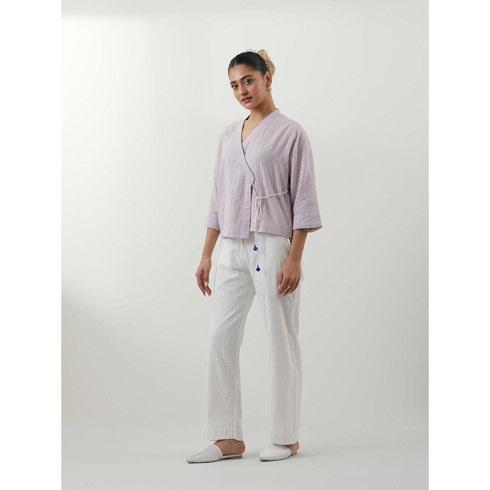 Description : Effortlessly Chic Lavender Textured Cotton Wrap Shirt Come With Contrast Piping Details On The Neck And Lace Trims On The Sleeves. Its Flattering Wrap Design Is Secured With A Delicate String That Has Contrasting Bead Tassels As A Highlight. Paired With Breezy White Textured Cotton Loose Pant, This 2-Piece Set Offers A Perfect Balance Of Style And Comfort, Ideal For Relaxed Weekends, Brunches, Or Casual Gatherings. Handcrafted In India -Garment Made On Order -The Model Is Wearing Size S, And Her Height Is 5 8 -See The Size Chart And The Size Guide Carefully