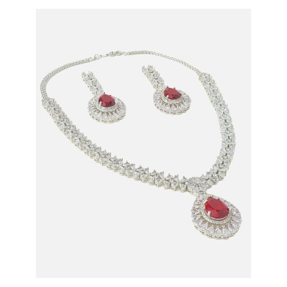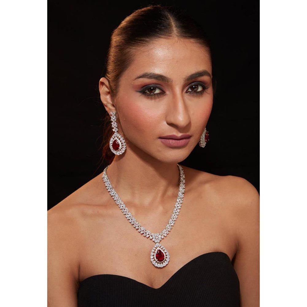 VIVINIA By Vidhi Mehra Silver Plated Red Womens Zircon Short Necklace Set With Earrings