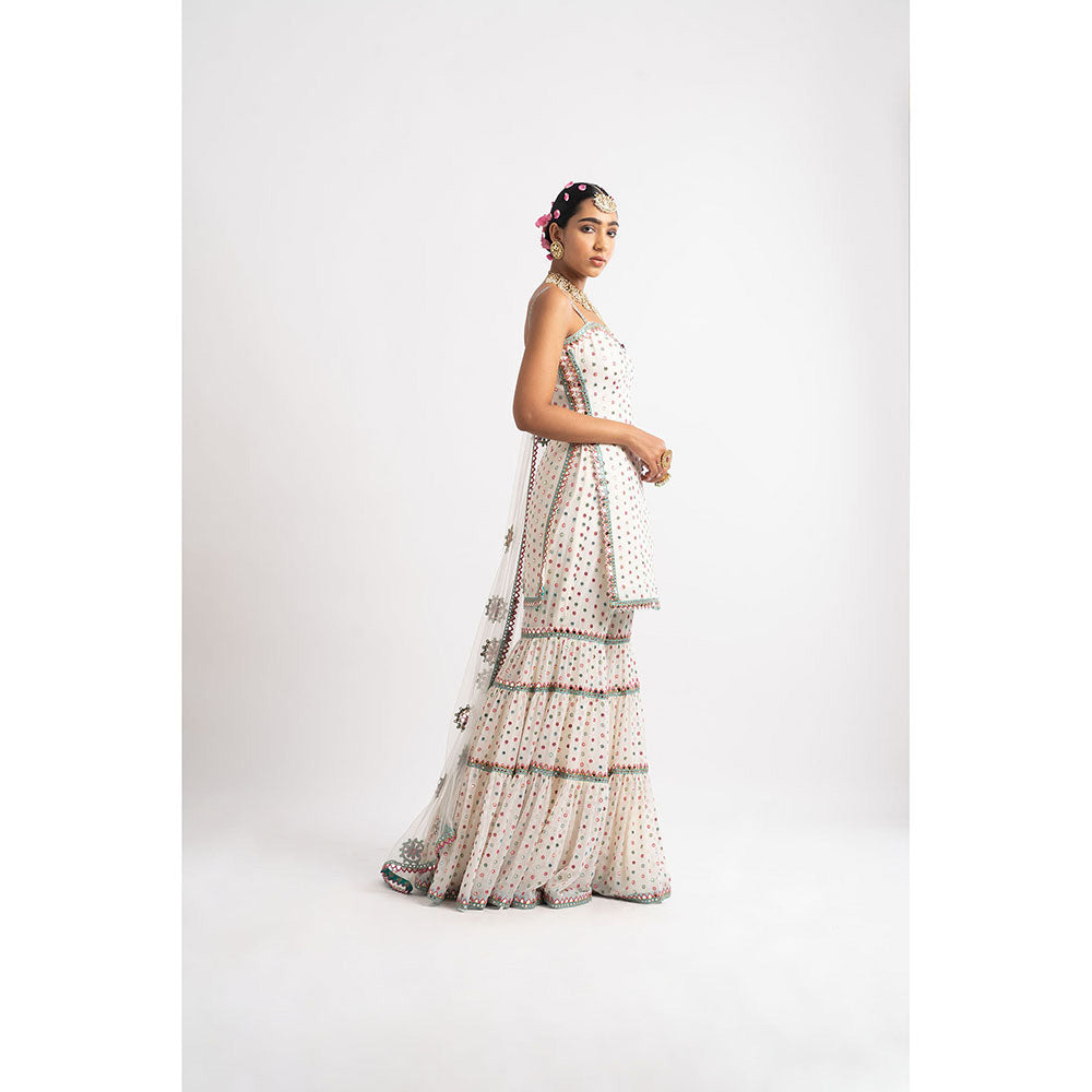 Vvani by Vani Vats White Multi Tier Multi Color Kurti with Sharara & Dupatta (Set of 3)