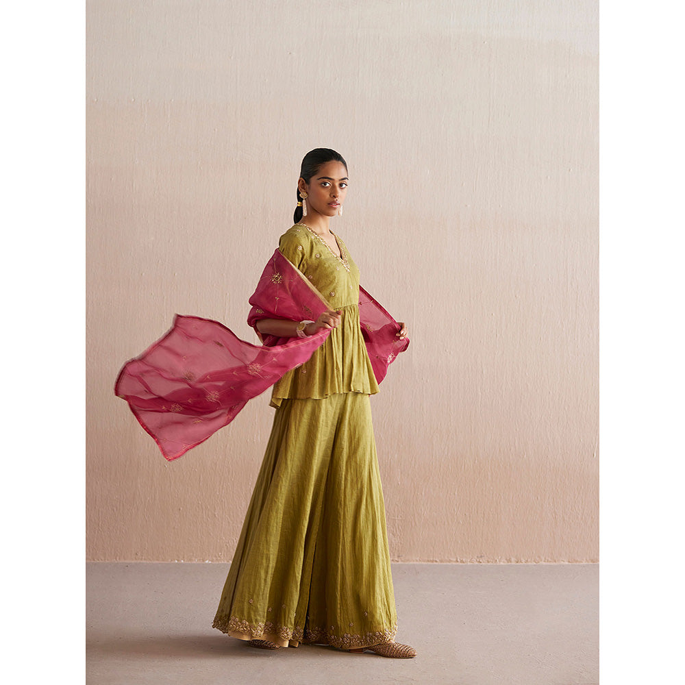 Izhaar Chartreuse Green Cotton Tissue Kurta with Skirt and Dupatta (Set of 3)