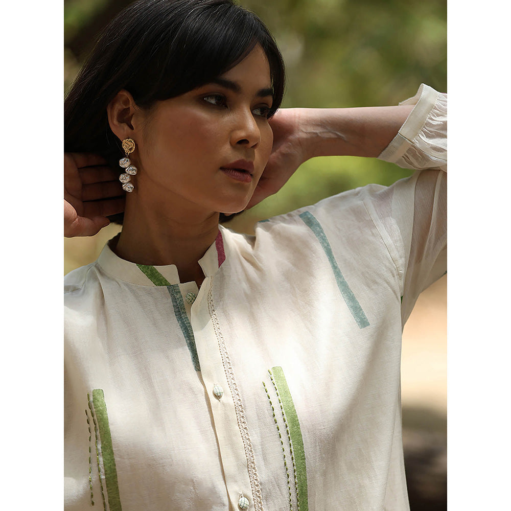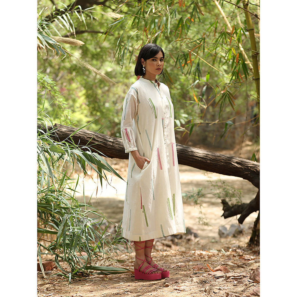 Description : Off White Handloom Pure Chanderi Shirt Hand Printed Dress with Hand Embroidered Kantha Details Float Through Lazy Summer Days In Our Ethereal White Handloom Pure Chanderi Shirt Dress. Meticulously Adorned with Hand-Block Printed Stripes And Kantha Hand Embroidery In Whimsical Shades Of Red, Green, And Blue, It's Like A Dreamy Escape On A Sun-Drenched Afternoon. Its Lightweight, Airy Fabric And Relaxed Silhouette Evoke A Carefree Mood, Perfect For Embracing The Enchantment Of Summer. with A Mandarin Collar And Gentle Gathers On The Sleeves, This Dress Is A Poetic Ode To Leisurely Days And Sunlit Dreams.
