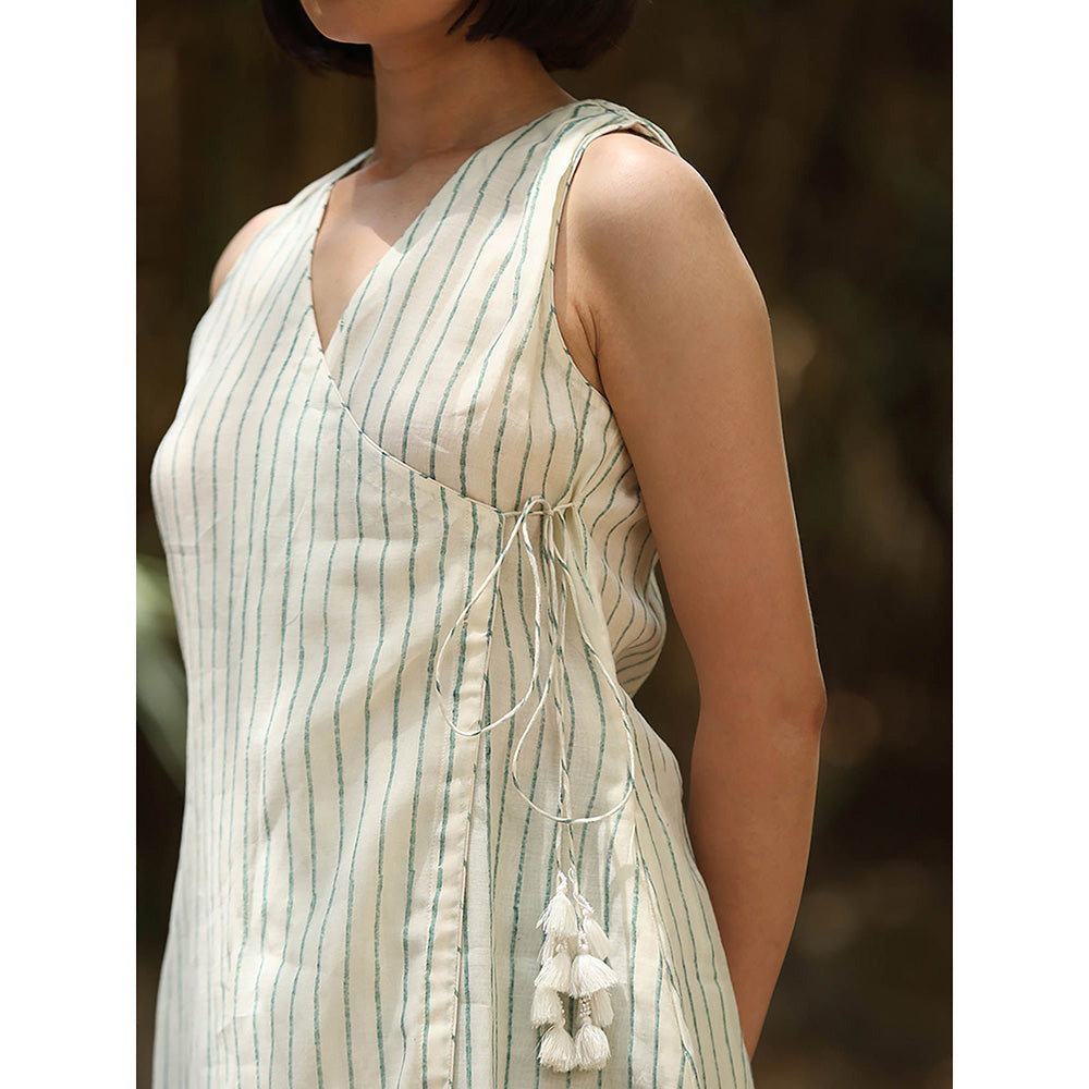 Description : White Handloom Pure Chanderi Wrap Around Hand Block Printed Kurta with Organza And Lace Details Drift Into The Carefree Embrace Of Summer with Our Enchanting White Handloom Pure Chanderi Wrap Around Kurta And Turquoise Blue Cotton Pants Co-Ord Set. Your Relaxed Companion For Days On The Move Or Special Occasions, This Ensemble Exudes A Dreamy Vibe, Perfect For Everything, From Leisurely Brunches To Long Days At Work. Crafted From Handwoven Mul Chanderi, The Kurta Is Designed Sleeveless with A Wrap Silhouette. Laid with Hand-Block Printed Stripes, It Is Finished with Delicate Organza And Lace Details. The Pants, Crafted In Cotton, Offer A Breezy, Easy-Going Fit. Embrace The Essence Of Summer In Style And Comfort with This Effortlessly Chic Pairing. Colour : White Fabric: Chanderi Silk Technique: Hand Block Print Note - Accessories Shown Are Only For Styling Purposes And Not Part Of The Product. This Product Has Been Shot In Natural Sun Light And There May Be A Slight Difference with Actual Colours. Delivery Time : 2-3 Weeks From Date Of Placing The Order. Made To Order Products Are Not Eligible For Exchange Or Return. The Suits Are Available In Standard Size Or Can Be Made To Measure, Where We Will Tailor The Outfit To Your Custom Measurements Taken Over An Email Post Receiving Your Order.